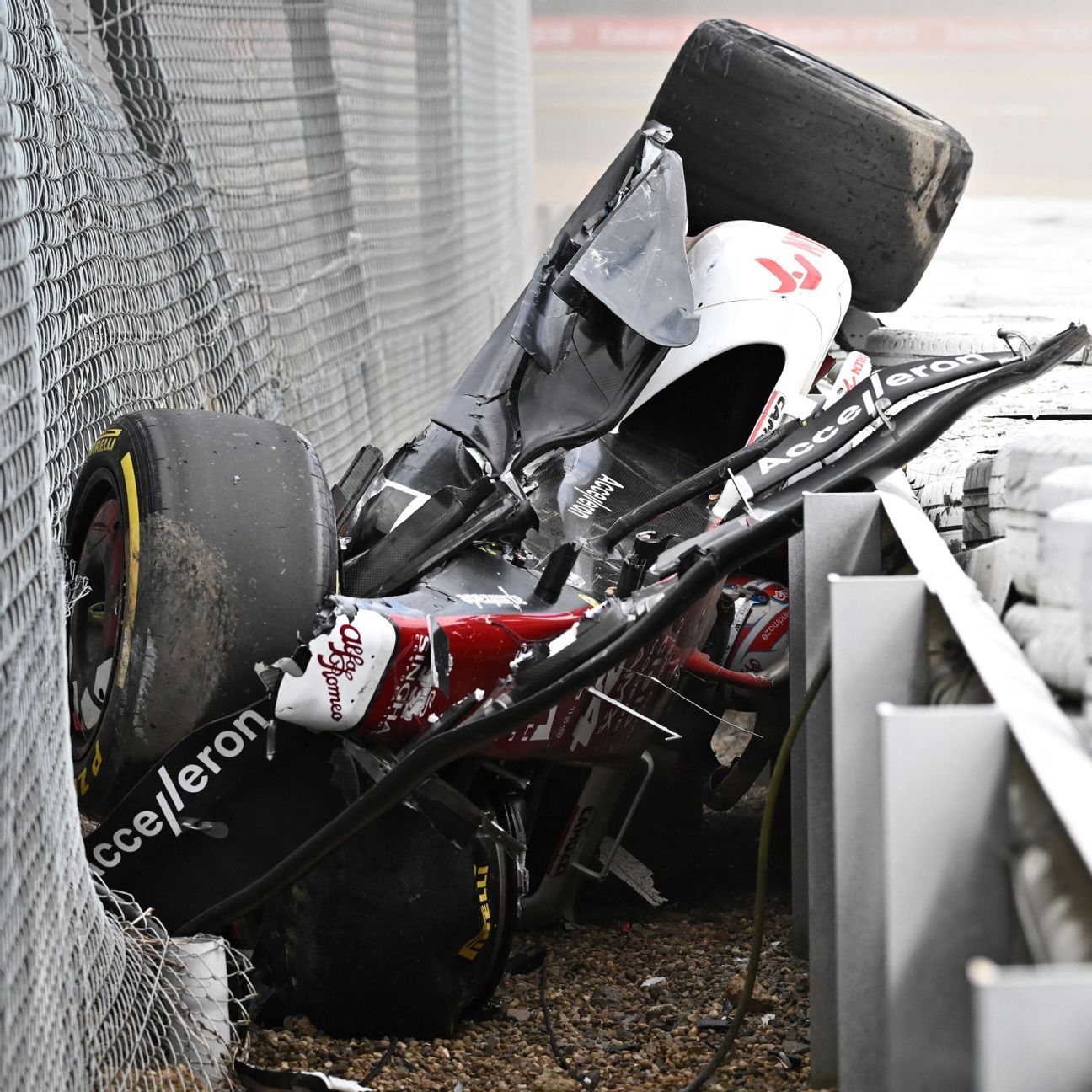 The first was where Zhou’s car ended up when it came to a rest. After being flipped over as a result of contact with George Russell, the Alfa Romeo skidded upside down through the tarmac run-off area before digging into the gravel beyond and barrel-rolling over the tyre barrier. The last bit of the accident pitched the car over the barrier that is designed to absorb impacts and into the catch-fencing beyond.