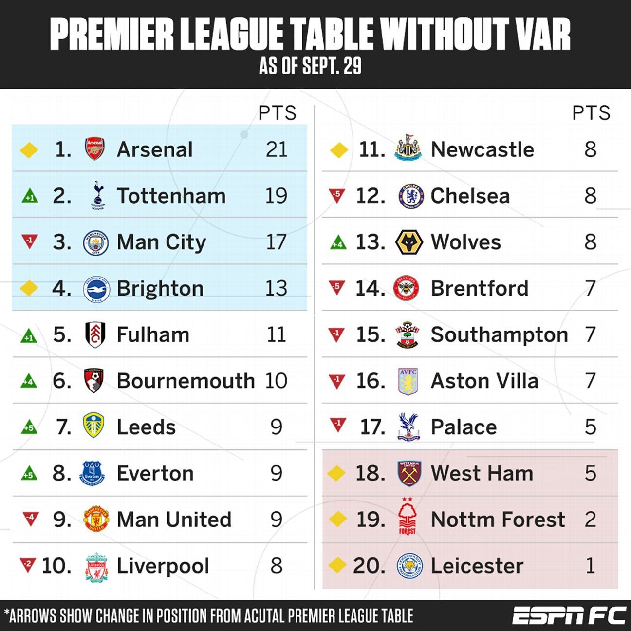 The table shows each team’s position after the amended results, with the arrows indicating if their league position is better or worse without VAR. It’s worth noting that not all teams have played the same number of games due to postponements.