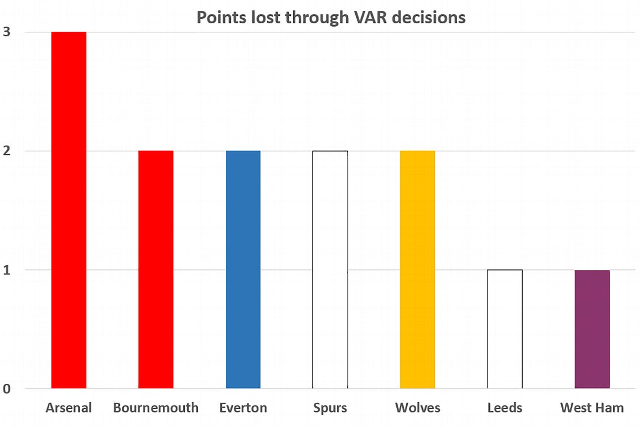 Look away, Manchester United fans, because it’s the Red Devils who have had the best of VAR this season and lose the most points without it. The key decision is that game against Arsenal, with the early VAR decision in their favour, meaning a victory becomes a defeat in our calculation.