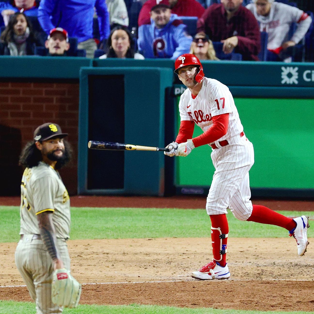 After the San Diego Padres roared out of the gate with four runs in the first, the Phillies roared right back with three runs in the bottom of the first — on their way to a four-homer outburst in a 10-6 victory that put the Phillies one win away from reaching their first World Series since 2009.