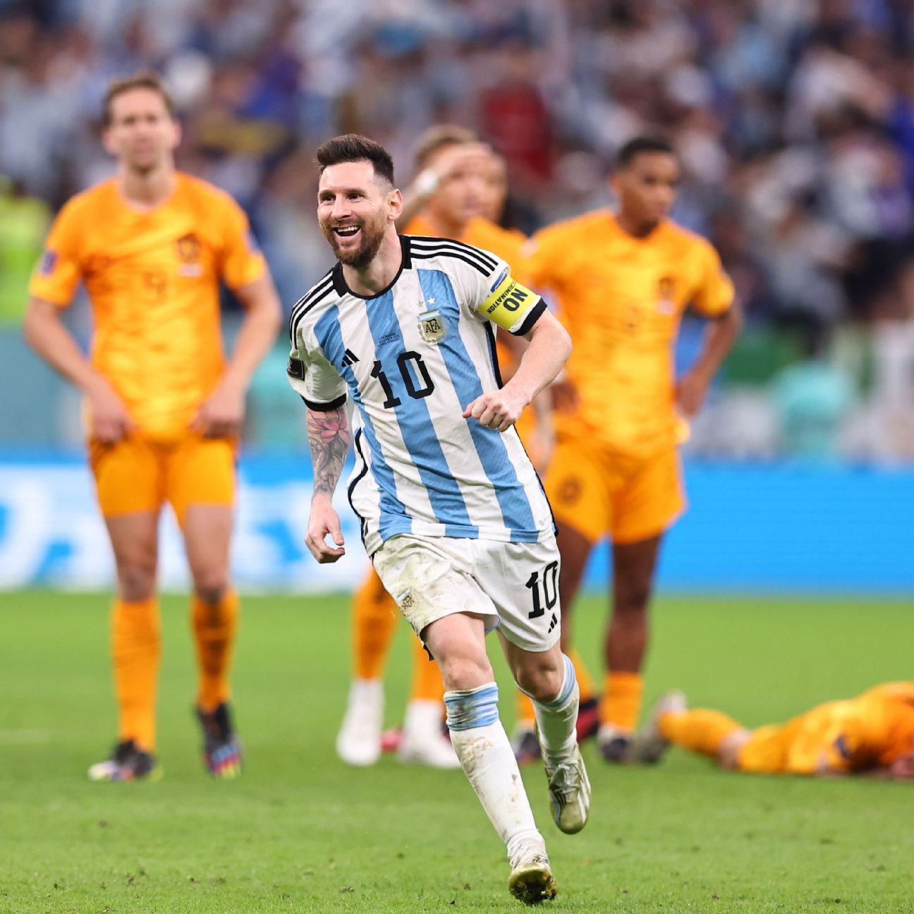 The first half was a fairly drab affair until Messi opened it up with a ridiculous reverse pass. He drifted along the edge of the Netherlands box and, with one flick, took four Dutch defenders out of the play and found the onrushing Nahuel Molina, who had space to side-foot it past Andries Noppert.