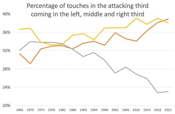 With each progressive World Cup, the ball has spent less time in central attacking areas and more time on either wing. And after the percentage of center-third touches increased a bit in 2006, it quickly went down from there.
