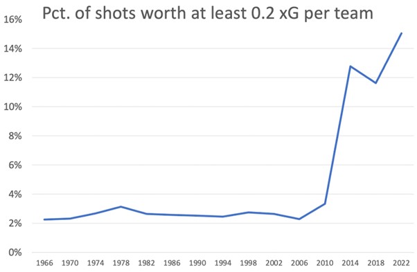 In 2010, Nigeria led the World Cup by averaging 0.085 xG per shot. In 2014, that would have ranked 23rd out of 32 teams, and in 2022 Denmark’s 0.085 ranked 29th. In 2010, 3.3% of shots were worth at least 0.2 xG; in 2022, it’s 15.0%.