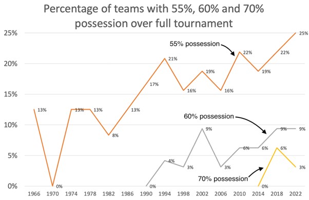 In Qatar, a full quarter of the field — eight of 32 teams — ended up with at least 55% of the ball. (It was nine teams until Croatia dipped to 54.8% after the semifinals.)